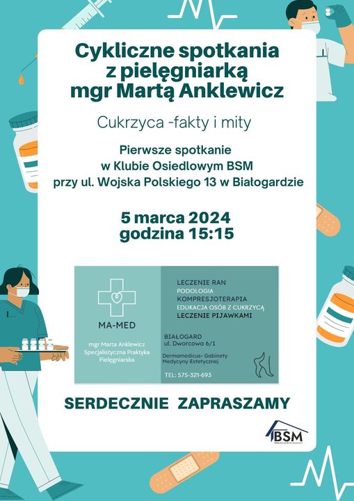 W Klubie Osiedlowym BSM przy ul. Woj. Polskiego13 w Białogardzie, odbyło się pierwsze z cyklu spotkań dla seniorów, dedykowanych zdrowiu, które poprowadziła mgr Marta Anklewicz, doświadczona pielęgniarka. Tematem dzisiejszego spotkania było jedno z coraz bardziej powszechnych schorzeń - cukrzyca.